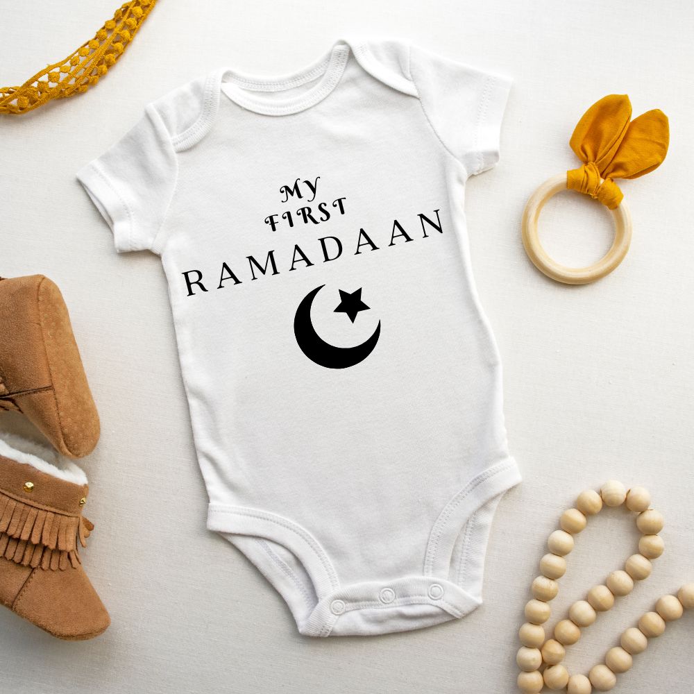 Your baby boy or girl will look adorable in our unique and one of a kind “Myfirst Ramadaan” baby vest.