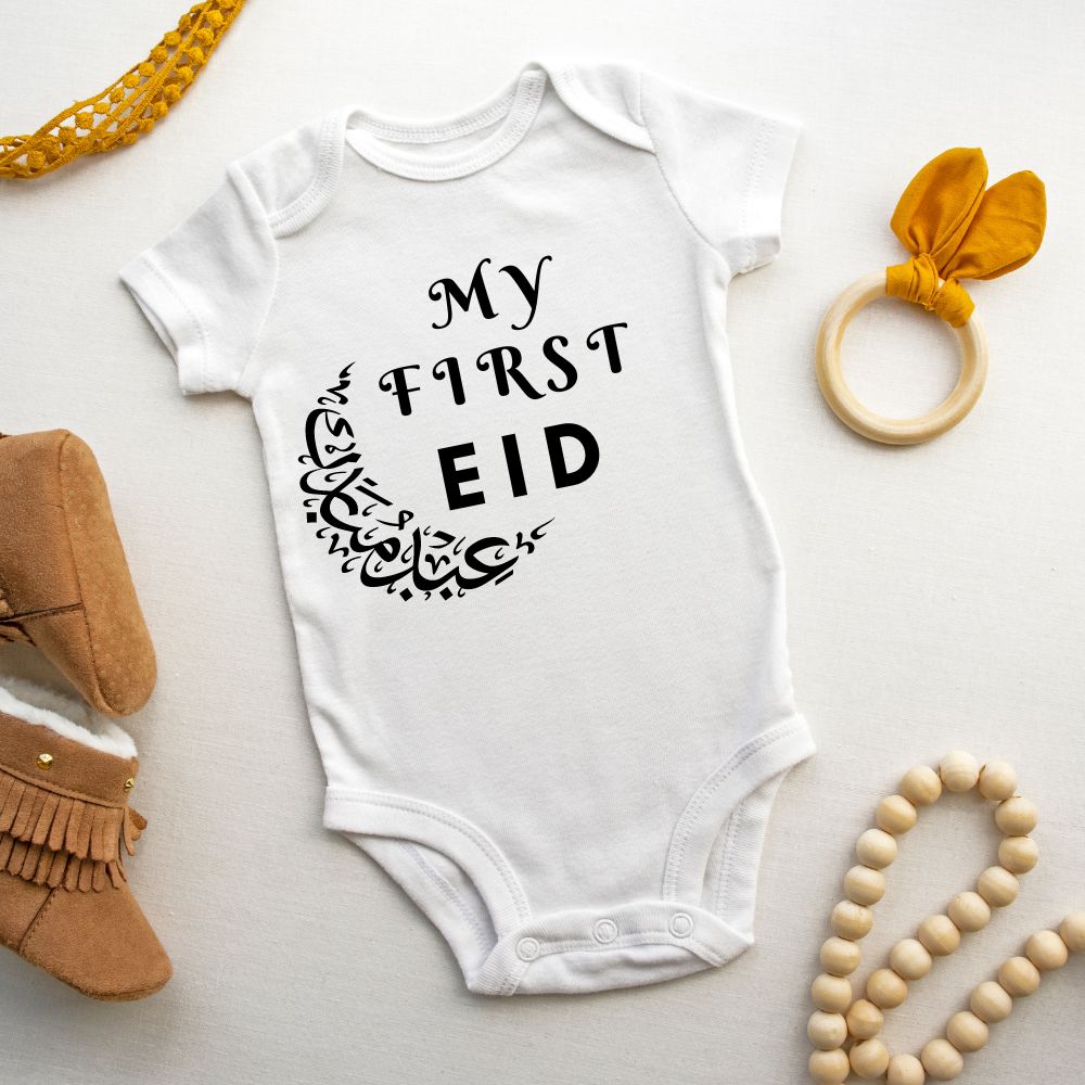 Your baby boy or girl will look adorable in our unique and one of a kind “My first Eid” baby vest.